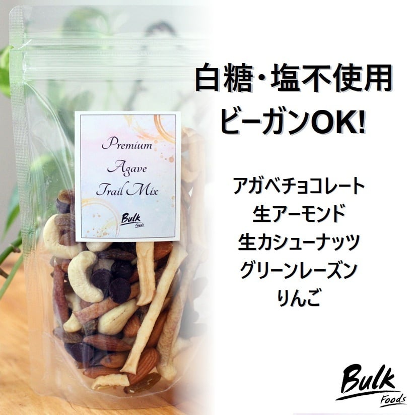 原材料名:生カシューナッツ(インド)、生アーモンド(米国)、グリーンレーズン(イラン)、りんご(国産)、アガベチョコレート(ペルー・カカオマス、アガベシュガー、ココアバター、ココアパウダー)